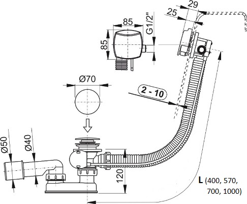 Automatický vaňový sifón v štandardnej dĺžke je určený pre použitie ku kúpacím vaniam s odtokom na okraji dna vane. Ak máte vaňu s odtokom uprostred dna vane alebo sa jedná o hlbokú vaňu (viac ako 45 cm) zvoľte predĺženú dĺžku.